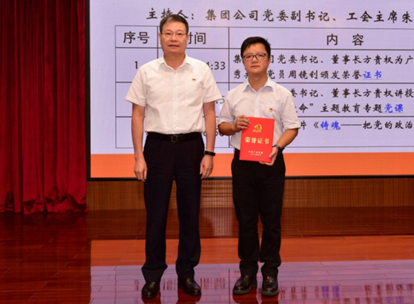 近日,穗聯(lián)公司“市勞動模范”周鏡釗榮獲“廣州市優(yōu)秀共產(chǎn)黨員”稱號。7月份集團公司黨組織書記例會上,集團公司黨委書記、董事長方貴權(quán)向周鏡釗頒發(fā)了榮譽證書。