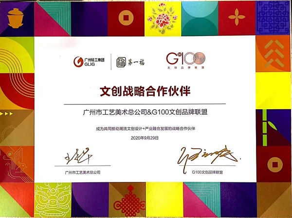 “G100創(chuàng)意100聯(lián)合品牌”是廣州創(chuàng)意產(chǎn)業(yè)協(xié)會(huì)、廣州文創(chuàng)品牌聯(lián)盟與GBDO組委會(huì)發(fā)起的聯(lián)盟認(rèn)證,在廣州市文化體制改革與文化產(chǎn)業(yè)發(fā)展辦公室指導(dǎo)支持下建立,從創(chuàng)作與提升廣州城市品牌形象的指導(dǎo)思想出發(fā),與各文創(chuàng)行業(yè)、企業(yè)一起產(chǎn)融共建。本次通過(guò)認(rèn)證,是相關(guān)機(jī)構(gòu)對(duì)廣州市工藝美術(shù)總公司致力于文創(chuàng)產(chǎn)品設(shè)計(jì)研發(fā)、活化非遺、廣州IP文旅點(diǎn)合作開(kāi)發(fā)的認(rèn)可。