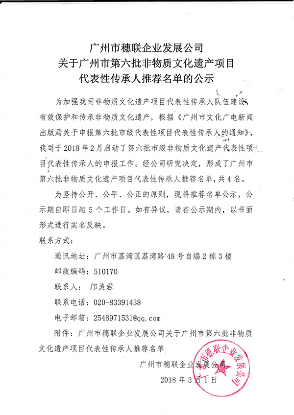 關(guān)于廣州市第六批非物質(zhì)文化遺產(chǎn)項(xiàng)目代表性傳承人推薦名單的公示