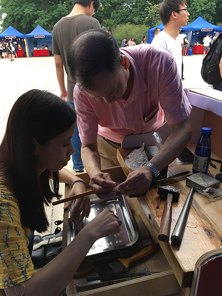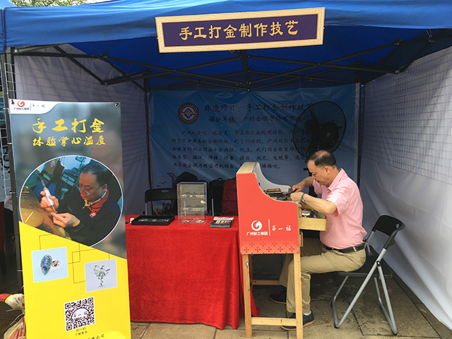 我司派出的該項(xiàng)目代表性傳承人甄世偉現(xiàn)場示范 “手工打金”技藝,吸引了不少市民街坊的關(guān)注。期間不時(shí)有“粉絲”向甄世偉請教打金技巧,還親自體驗(yàn)了一番手工打金掌心溫度的魅力。